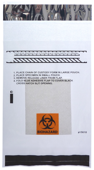 These 6 x 9″ polyethylene specimen bags feature a removable, adhesive release liner that secures specimen containers in a liquid-tight primary pouch. Fold and insert requisition in second pouch. Once the bag is sealed, both pouches are tamper-evident which provides protection of specimen and sensitive patient information during the transport process. Each bag comes with a 3 x 4” absorbent sheet.